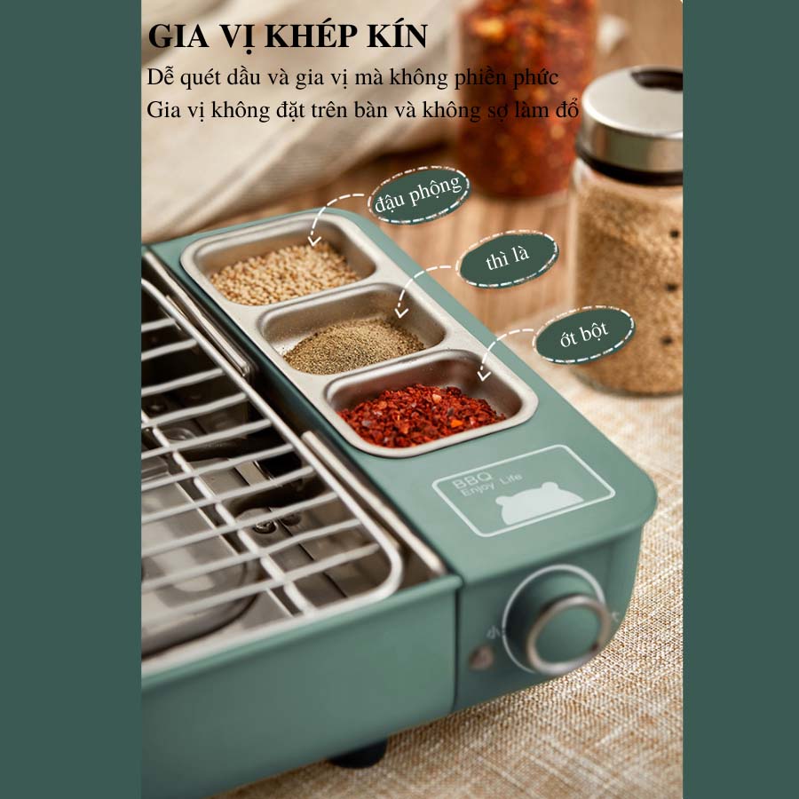 - Hộp gia vị được đặt trong khe hộp gia vị ở phía bên phải của phần bếp chính, và đặt một trong hai loại chảo nướng hoặc vỉ nướng (lựa chọn theo nhu cầu thực phẩm) lên khung đỡ trên vỏ của bếp chính.