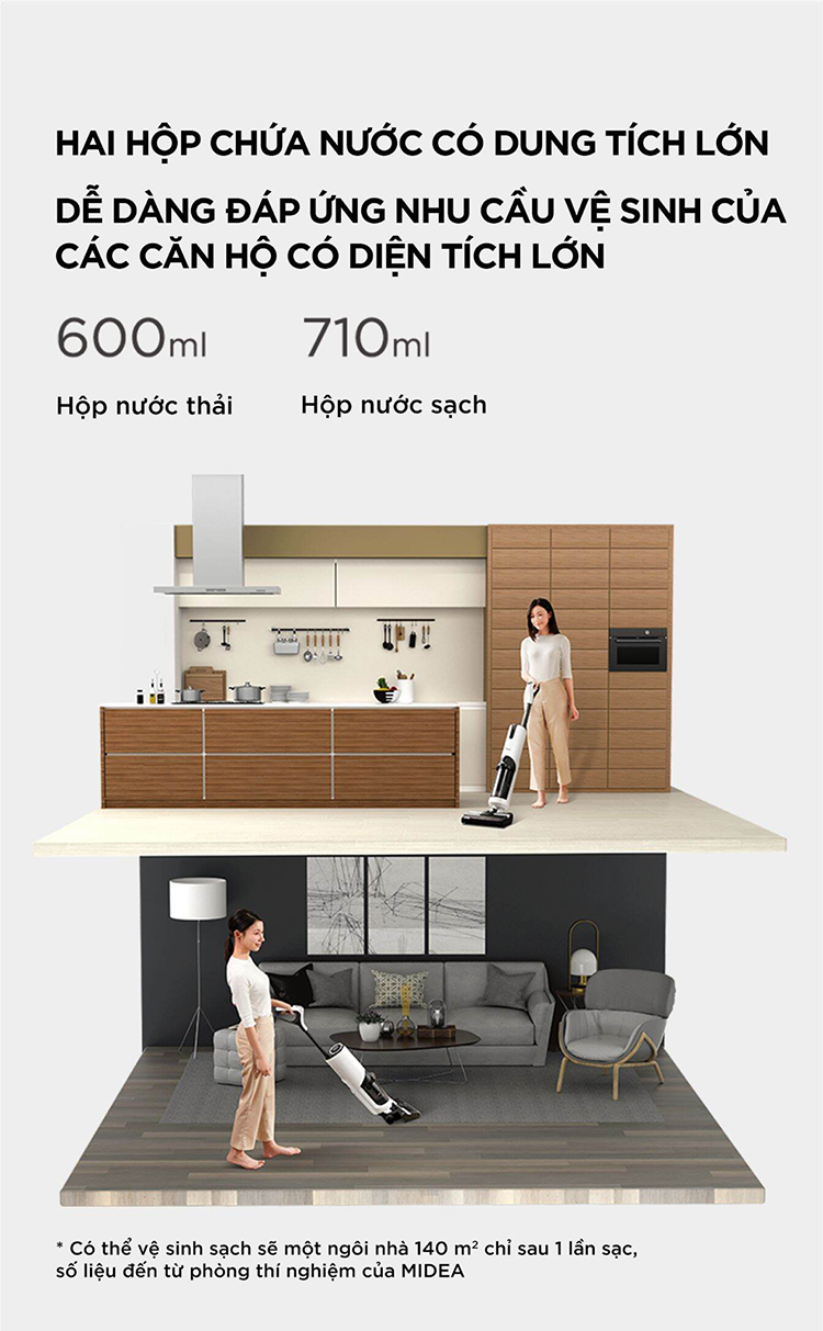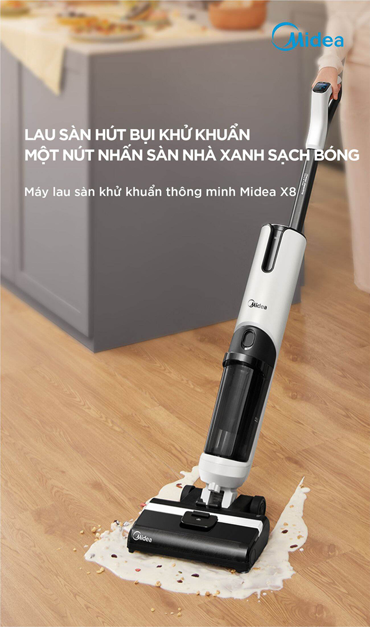 Máy hút bụi lau nhà Midea X8 thiết kế tiện lợi vừa hút bụi vừa lau sàn, bộ lọc HEPA làm sạch ưu việt, công suất hút mạnh mẽ 10000 Pa, pin hiệu suất cao cho thời gian sử dụng lâu khoảng 35 phút.