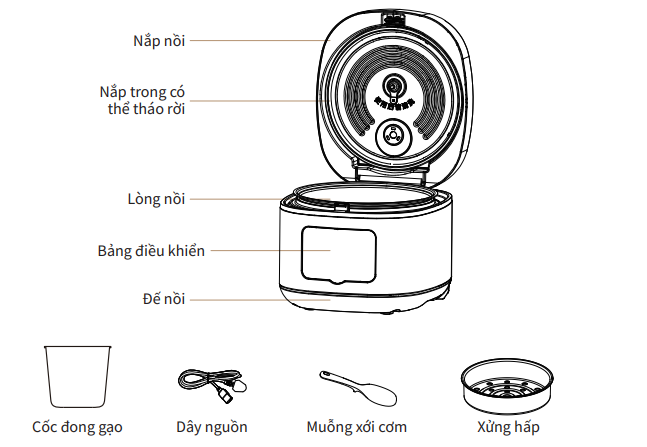 - Tháo túi đóng gói nồi cơm điện, mở nắp và lấy tất cả các phụ kiện bên trong nồi ra.